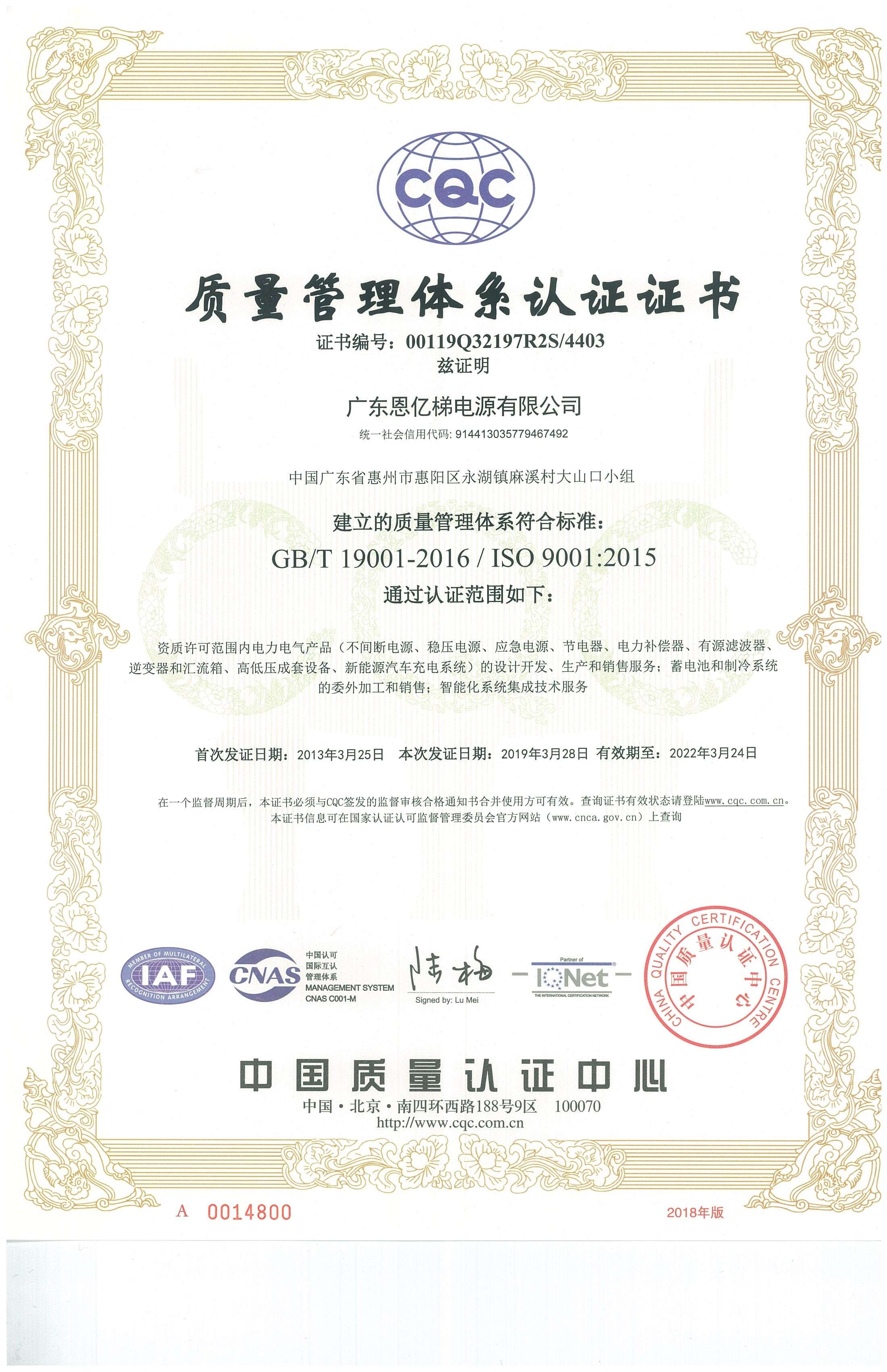 ISO9001質量管理體系認證證書